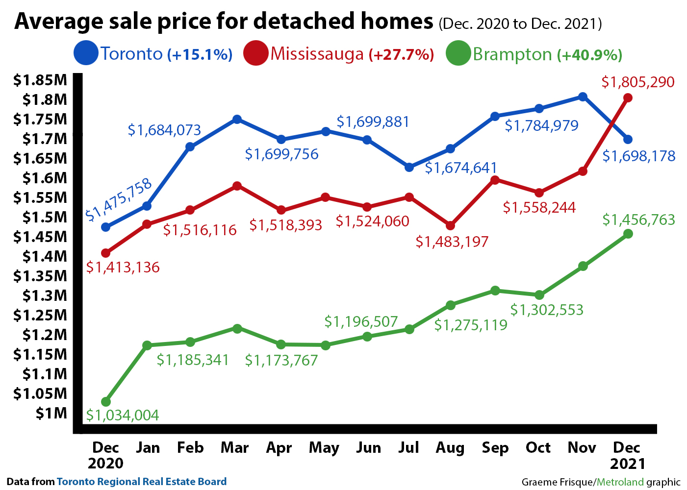 Primarily based on share progress, indifferent properties in Brampton led the best way, rising 40.9 per cent from a median sale worth of $1,034,004 in December 2020 to a staggering $1,456,763 to shut out 2021.