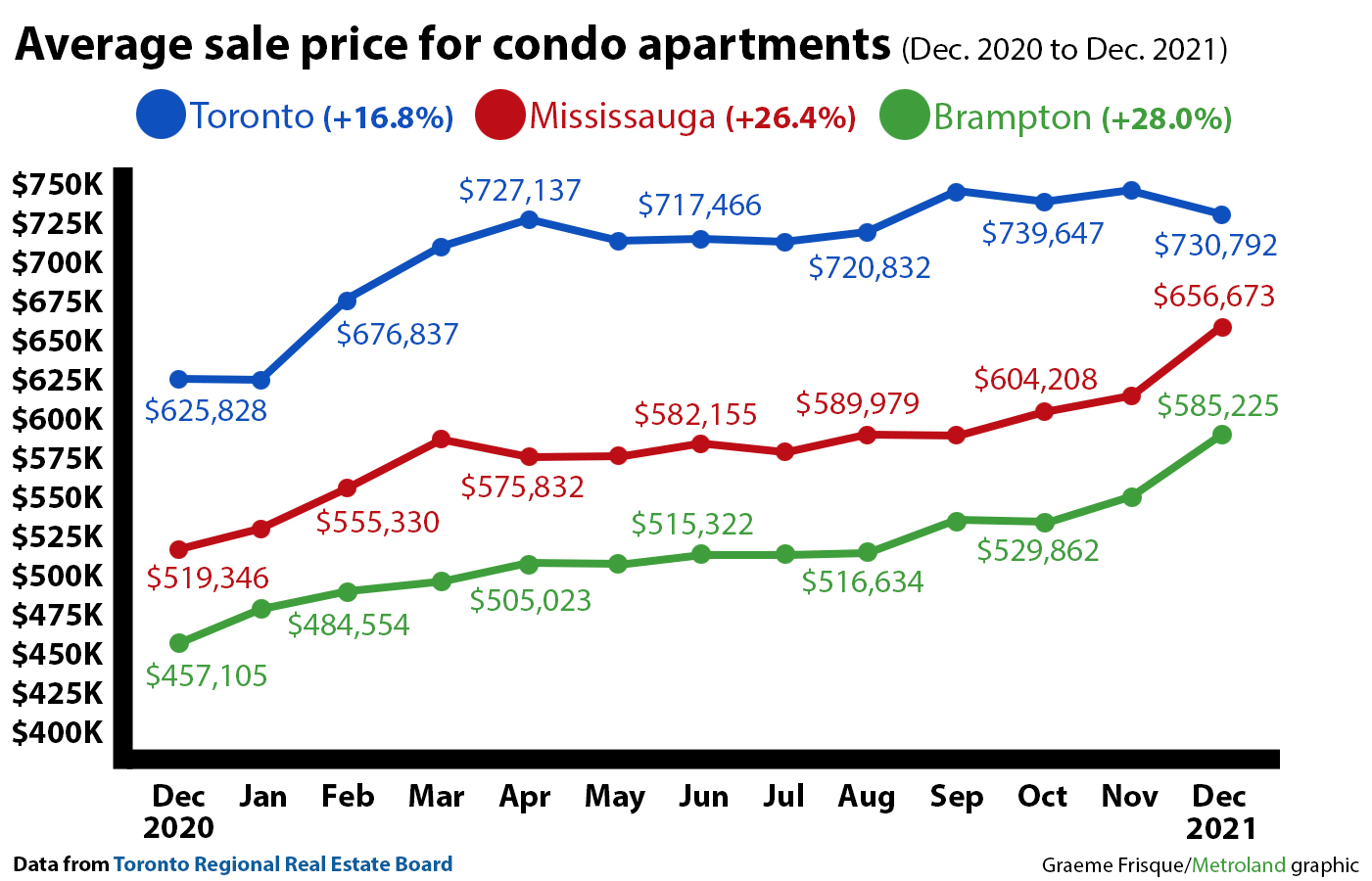 The story was the identical for condominiums, though much less pronounced. Residence-style condos in Brampton noticed a 28 per cent spike in common sale worth to $585,225 in December 2021 in comparison with $457,105 the identical month final 12 months.